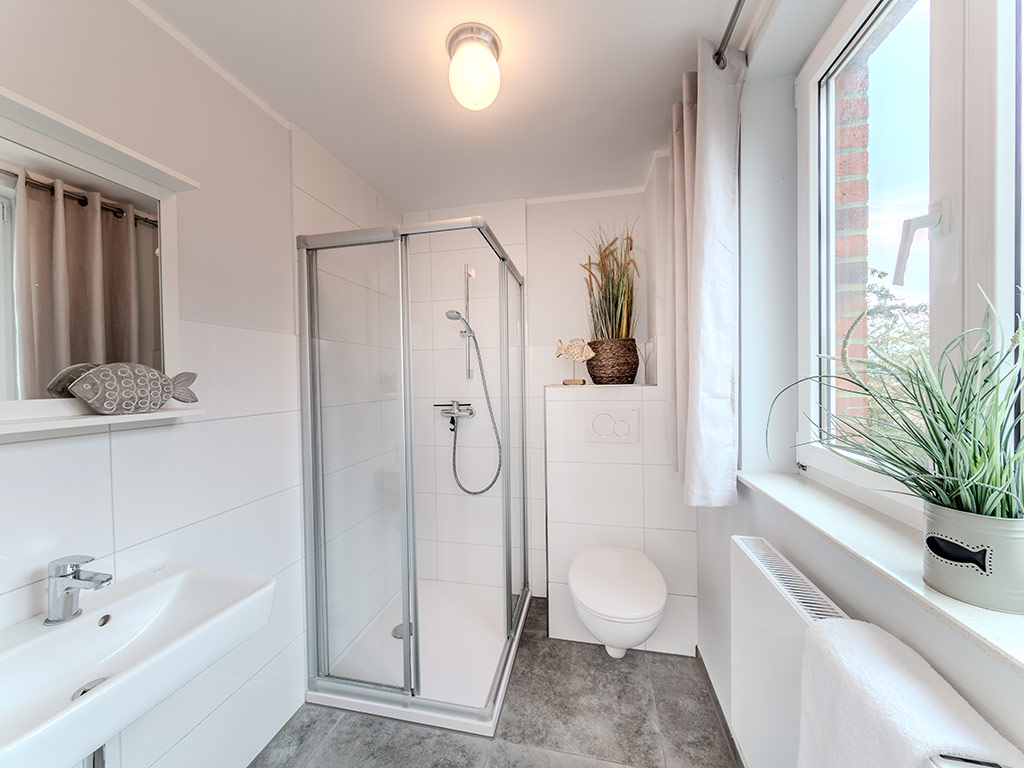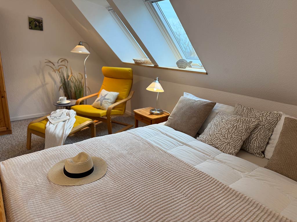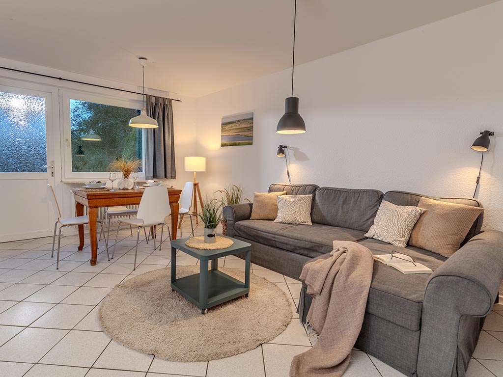 Die praktische Erd-Geschoss-Wohnung ist ebenerdig. Mit einer Schlaf-Couch und dem großen Bett eine optimale Unterkunft für Familien. Die sonnige Terrasse ist direkt vor der Türe mit Blick ins Schilf.